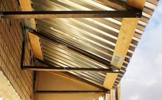 - Независимая крыша на балкон. Вариант независимой крыши — это стальные или деревянные фермы, на которые монтируется кровельный материал, крепятся к стене вашего дома. Больше креплений у ферм нет, поверх них крепится обрешётка, на которую укладывается кровельный материал. Такая крыша выдерживает большие снеговые и ветровые нагрузки. В зависимости от размера балкона изготавливается несколько металлических уголков-ферм.